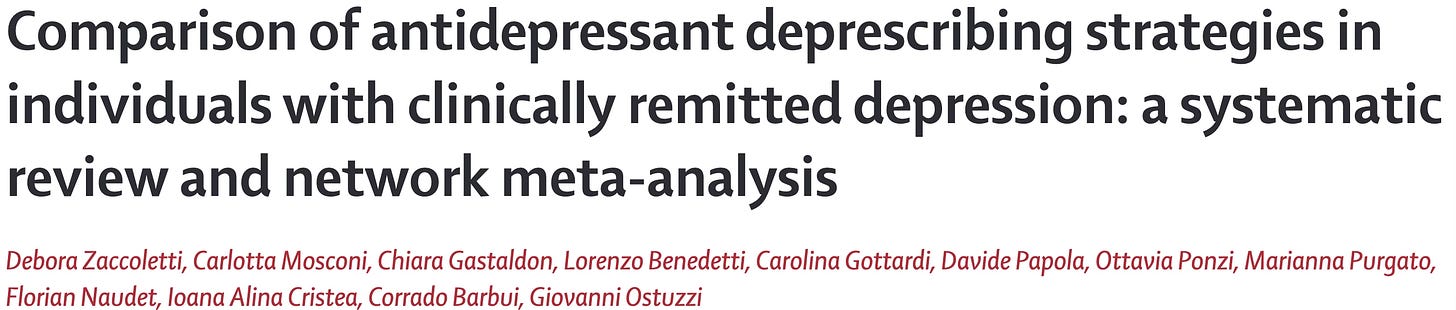 Zaccoletti D, Mosconi C, Gastaldon C, et al. Comparison of antidepressant deprescribing strategies in individuals with clinically remitted depression: a systematic review and network meta-analysis. Lancet Psychiatry 2026;13:24–36. doi: 10.1016/s2215-0366(25)00330-x