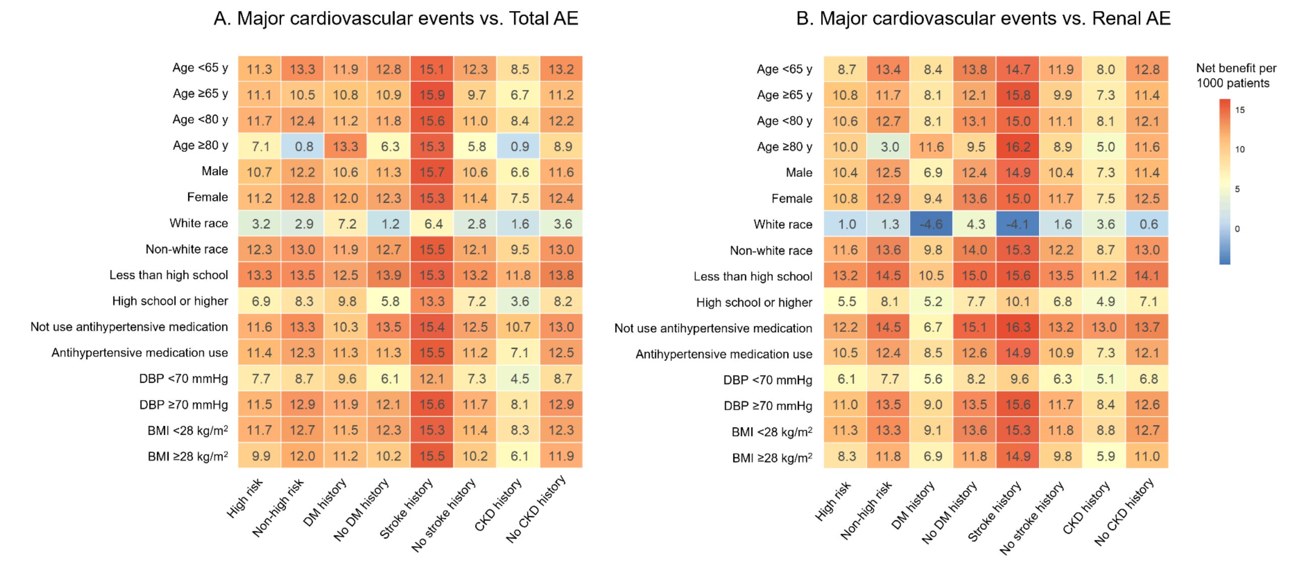 Und tatsächlich findet sich um Supplement der der Publikation auf Seite 31 eine Phänotypisierung der Nettonutzen-Berechnungen. Und danach geht bei sogenannten „Weißen“ (gemeint sind hier nordamerikanische Menschen mit heller Haut und meist europäischen Vorfahren [aus ACCORD-BP und SPRINT]) der Nettonutzen rasch nach unten und ist mit Fokus auf renale Nebenwirkungen teils sogar negativ.