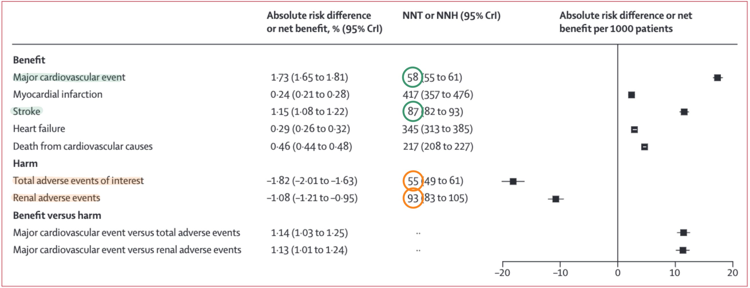 Immerhin: In ihrer Arbeit dröselt die BPRULE Study Group die kombinierten Endpunkte so weit wie möglich auf. Nicht überraschend zeigt sich, dass der Nutzen maßgeblich durch die Reduktion von Schlaganfällen getrieben wird, bei Infarkten oder Herzinsuffizienz die NNT hingegen viel höher ausfällt.