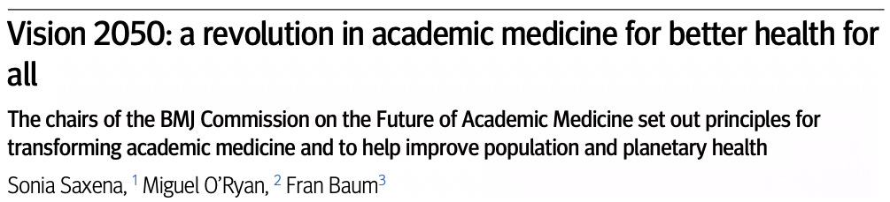 Saxena S, O’Ryan M, Baum F. Vision 2050: a revolution in academic medicine for better health for all. BMJ 2025;389:r561. doi: https://doi.org/10.1136/bmj.r561