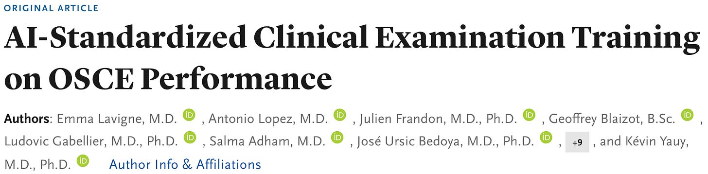 Lavigne E, Lopez A, Frandon J, et al. AI-Standardized Clinical Examination Training on OSCE Performance. NEJM AI Published Online First: 14 July 2025. doi:10.1056/aioa2500066